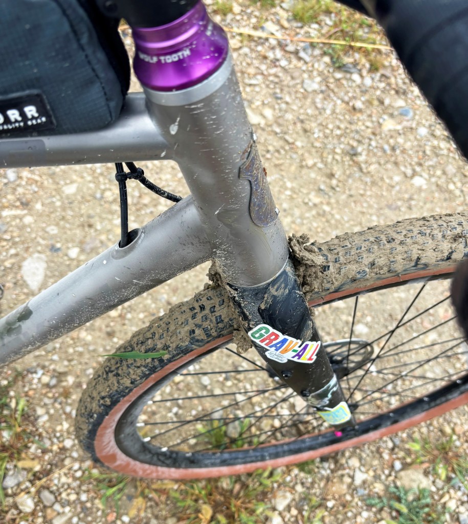 Earlier in the week I had installed some 700×50 American Classic Krumbein tires. The official max clearance on my Lynskey GR300 is 700×45 so I knew I was really pushing it. The rear triangle has plenty of clearance for the chunky tires, but the fork has zero clearance. Within about six feet of hitting the mud I ground to a halt. I decided to shoulder my bike and hike the rest of the way till I hit more solid ground. At the end of the MMR section there were plenty of puddles and sticks for me to clean up the bike and my shoes. After about ten minutes of scraping, cursing, and stomping around in a puddle I was up and rolling again.